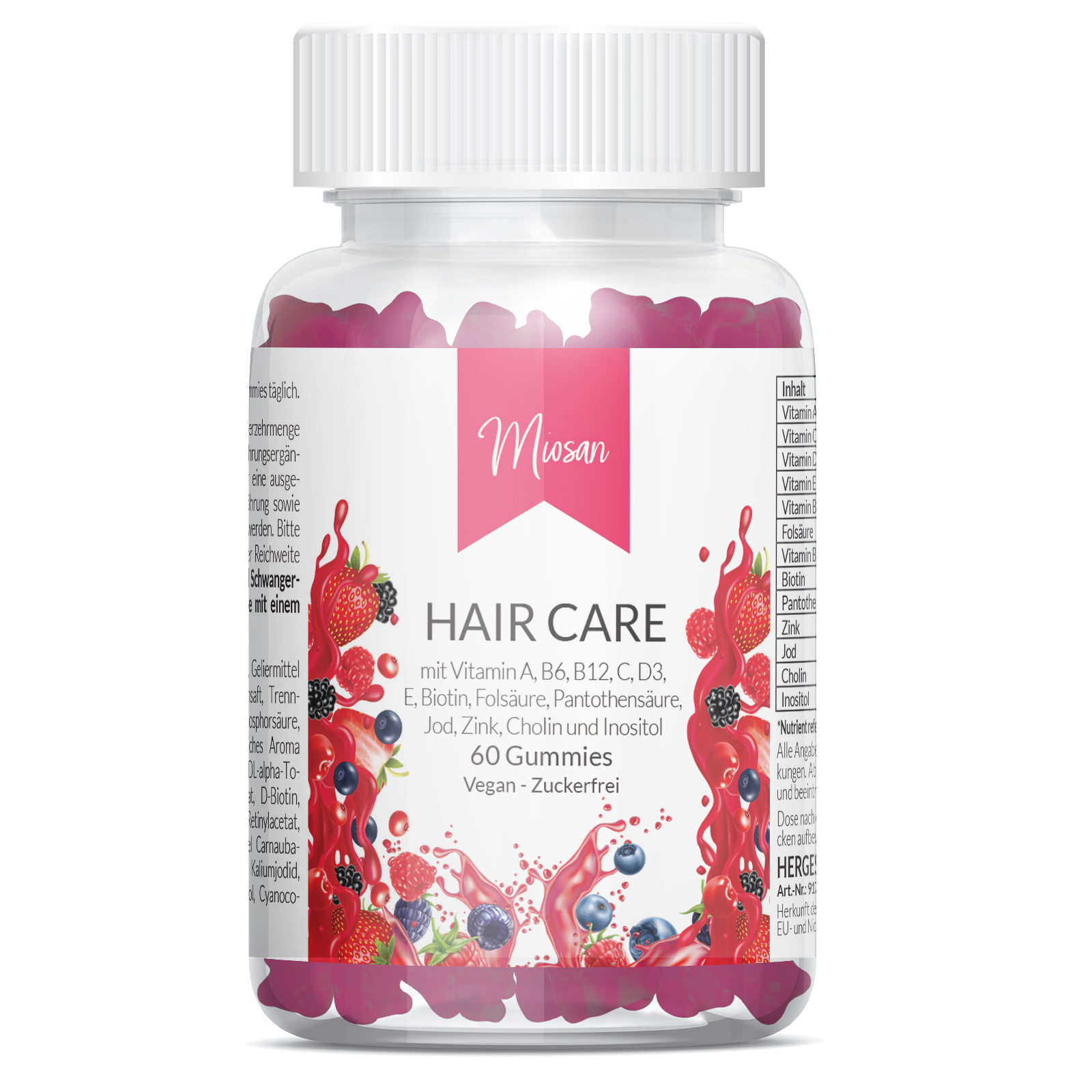 Miosan Hair Care liefert eine nährstoffreiche Kombination speziell für dein Haar – in praktischer Gummibärchenform. Enthalten sind unter anderem Biotin, Folsäure, Zink, sowie Vitamine wie A, B6, B12, C, D3 und E. Mit 60 Gummies reicht die Packung für 30 Tage bei einem Tagesverzehr von 2 Stück. Die Rezeptur ist frei von künstlichen Farb- und Zusatzstoffen und speziell auf die weiblichen Bedürfnisse abgestimmt.