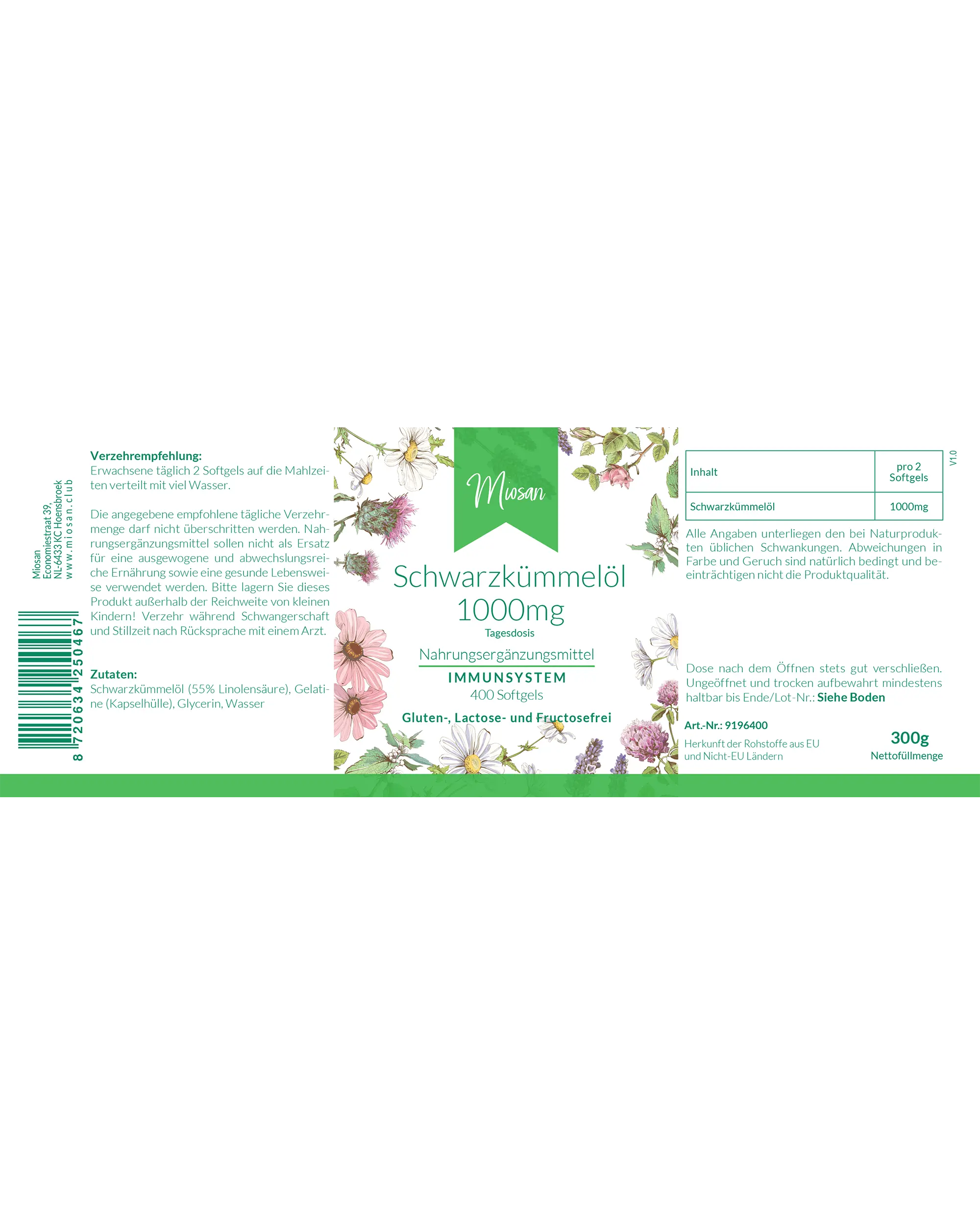 Produktinformationen "Schwarzkümmelöl 1000mg Tagesdosis - 400 Softgels - Schluckfreundlich | Miosan"
